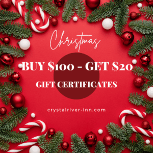Crystal River Inn & Cottages will email a bonus gift certificate for every $100 spent in gift certificates! Purchase online or call us at 715.258.5333. Thank you for supporting small local family owned businesses this holiday season! We promise to treat your family like our own! Merry Christmas from Crystal River Inn & Cottages! Offer Ends on 12/31/2025. Gift Certificates are valid for 1 year.